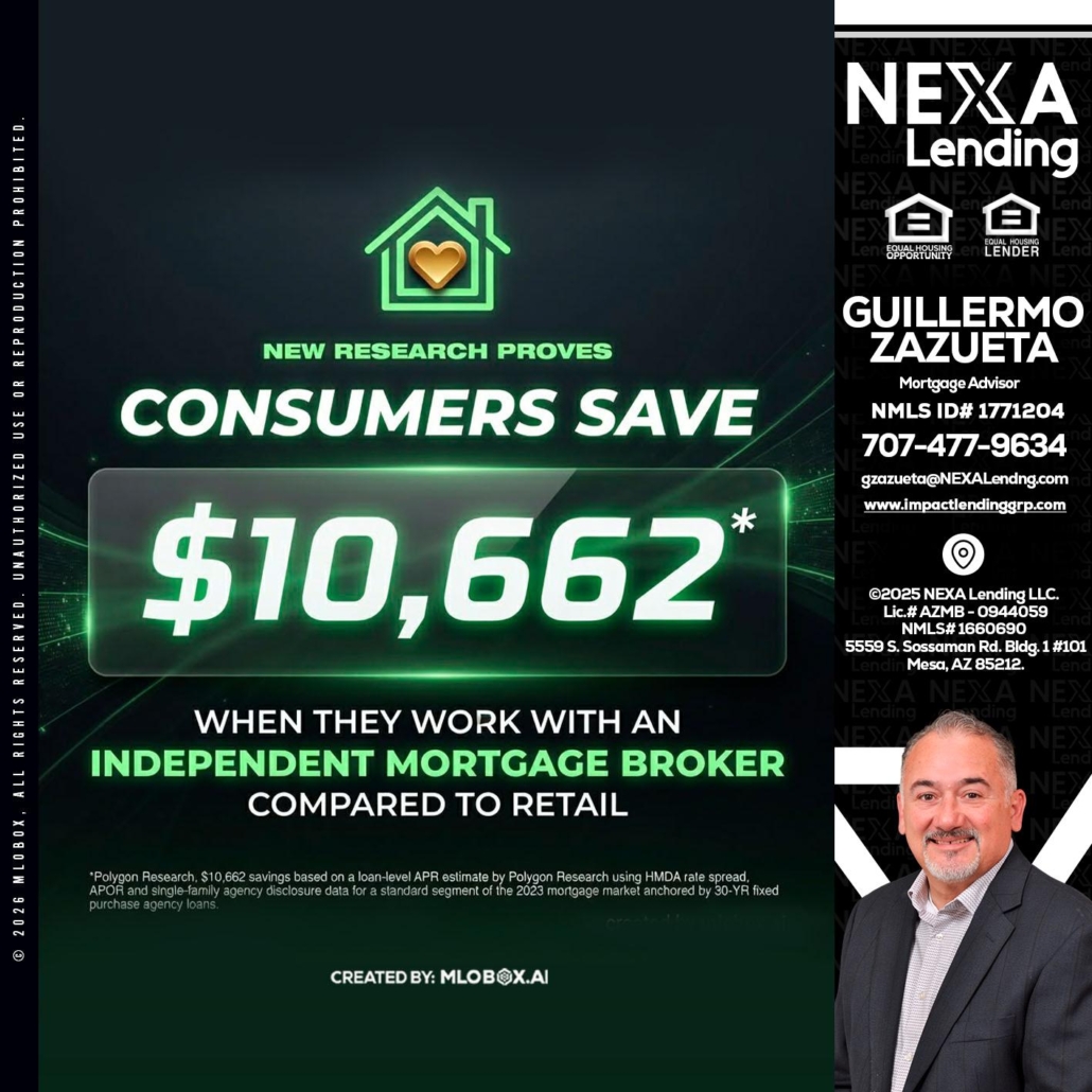 10,662 - Guillermo Zazueta -Mortgage AdvisorHi, my name is Guillermo Zazueta. I’m a Loan Officer with NEXA Lending LLC., offering personalized mortgage solutions, fast customized quotes, great rates and service with integrity.