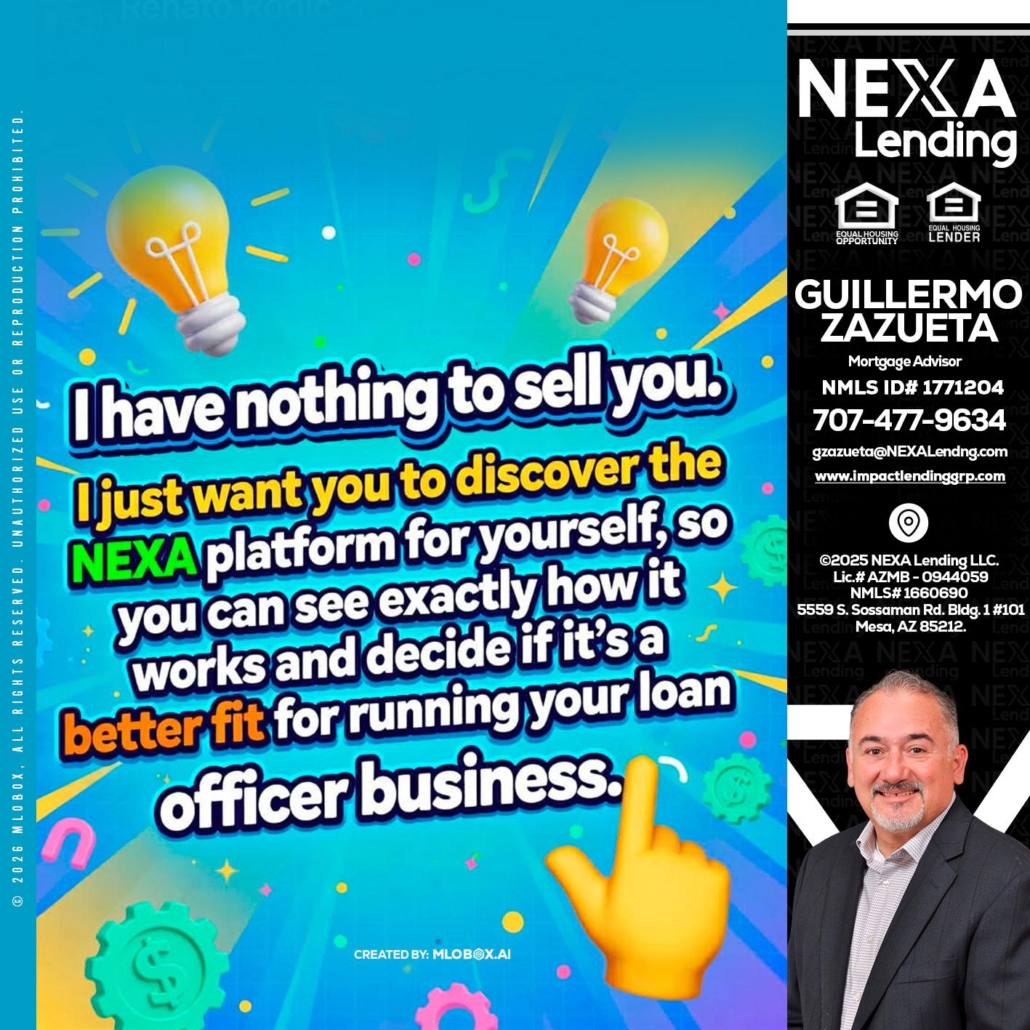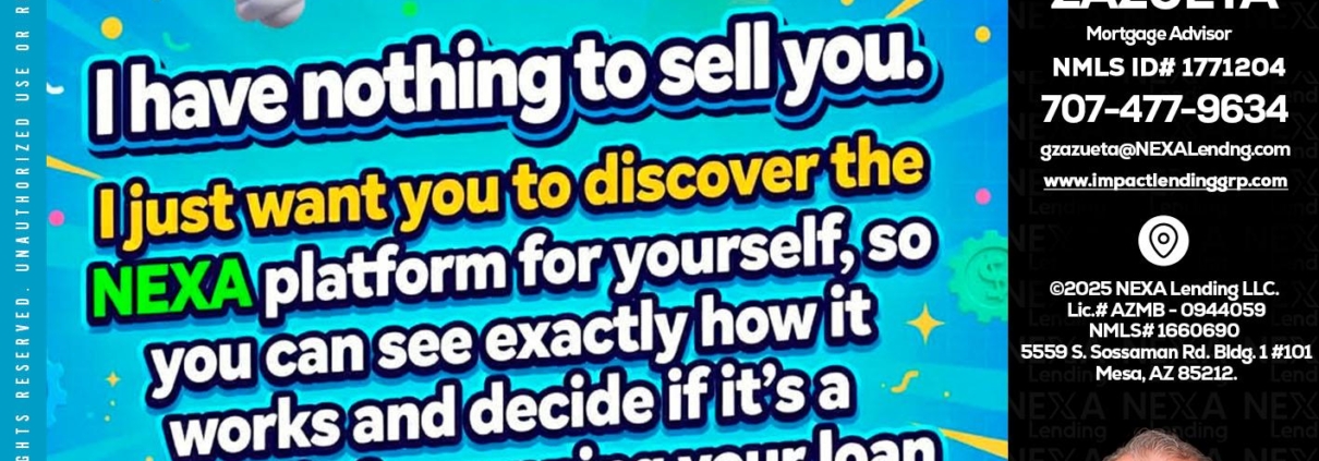 Hi, my name is Guillermo Zazueta. I’m a Loan Officer with NEXA Lending LLC., offering personalized mortgage solutions, fast customized quotes, great rates and service with integrity.