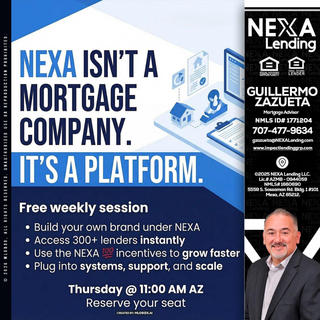 NEXA ISNT - Guillermo Zazueta -Mortgage AdvisorHi, my name is Guillermo Zazueta. I’m a Loan Officer with NEXA Lending LLC., offering personalized mortgage solutions, fast customized quotes, great rates and service with integrity.